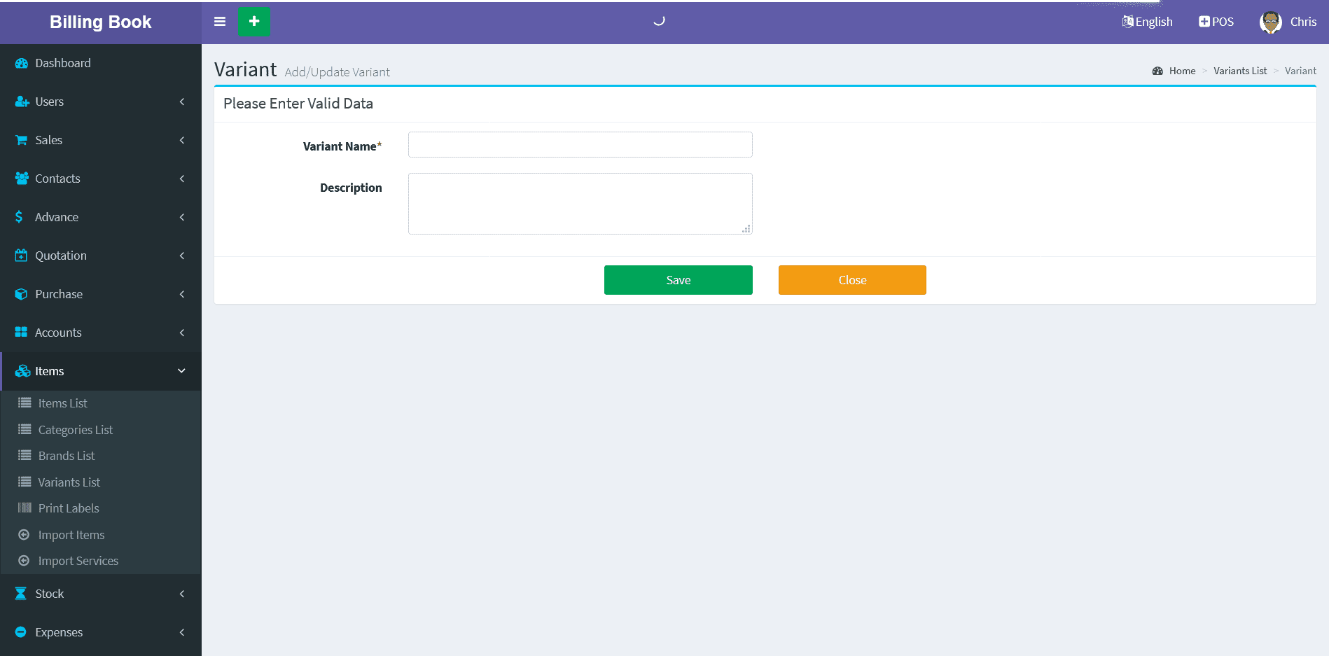 Adding a Items it's a very easy task. Enter Item name, Select Category, Unit, SKU(Optional Field), Alert Quantity(Optional field), Select Image(Optional field),Purchase Price(Without Tax), Select Tax, Tax Type(Inclusive / Exclusive), Profit Margin(in Percentage %) , Available/Current Stock(+/-) (Optional Field), Add Lot number(Optional), Expired Date(Optional) and click on Save button.